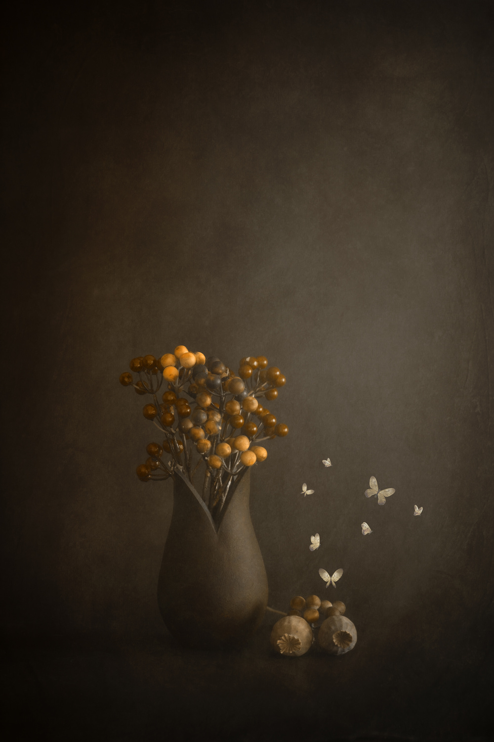 When I take still life images, I prepare my background first. Then I choose the vase and the flowers or other props. The next step is to set up the composition. When all this is set, I start shooting in manual mode. I prefer to use natural light, so most of my images are long exposures. I usually take multiple images. The final step is putting these images on my computer and choose the one or more that I want to edit. While I am adjusting the main aspects like contrast and light I decide on the mood of the image. Then the creative part starts. I use Photoshop and my plug-ins to shape the image as I wish.